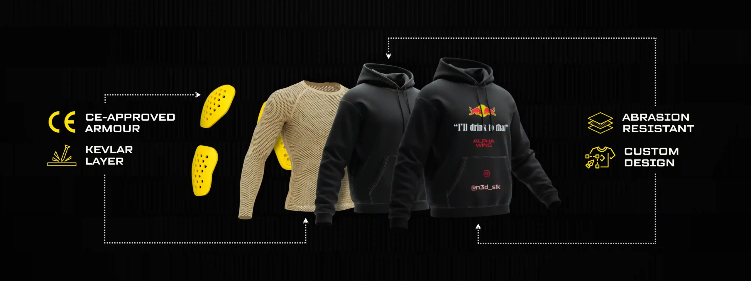 Totally blown away by the quality of it. This armoured hoodie was custom designed and the quality of prints looks just awesome! Kevlar layer inside is super strong and the pads on Shoulders, Elbows and back are very nice! Surprised how comfy it is! Loved the product! Recommended !!